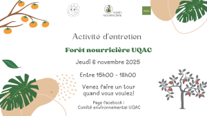 Le Comité vert de l’UQAC vous invite à venir nous rejoindre pour une activité d’entretien de la Forêt Nourricière qui nous appartient à tous et toutes ! Venez nous rejoindre dès que vous voulez entre 15h et 18h ce jeudi 8 novembre à la Forêt Nourricière de l’UQAC qui est située à l’extrémité Ouest du campus de l’université !