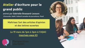 Au Canada, 71% des personnes citées dans les médias sont des hommes, contre à peine 29% de femmes. Afin de s’attaquer à cette inégalité, cet atelier d’une durée de deux heures donnera donc des trucs pratico-pratiques pour la publication de lettres ouvertes dans les médias et d’essais grand public. Nous invitons les professeures, mais aussi les chargées d’enseignement, postdoctorantes et étudiantes de cycles supérieurs à s’inscrire! Nous portons une attention particulière à la diversité des voix de femmes, tant en termes d’orientation sexuelle ou d’identité de genre (personnes de la diversité de genre sont bienvenues!), d’origine ethnique, de handicaps, ainsi que les universitaires en situation de précarité économique. Cet atelier est réalisé avec la collaboration de Perspectives Plurielles/Informed Perspectives (anciennement Femmes Expertes).