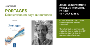 Paul Dionne, avocat et pionnier en droit autochtone, se joindra à nous au campus le 25 septembre 2025, de 11 h 20 à 12 h 40, au local P1-4280. Il y donnera une conférence inspirée de son ouvrage « Portages (Découvertes en pays autochtones) », publié chez l’éditeur Septentrion. Cette conférence est ouverte à toute la communauté étudiante dans le cadre de la 61e édition du Salon du livre du Saguenay–Lac-Saint-Jean.