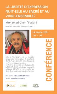 La CERII et le CELAT de l’UQAC vous invitent ce jeudi 25 février 2021 de 14 h à 17 h à la conférence webinaire de monsieur Mohamed Cherif Ferjani, professeur émérite à l’université Lyon 2 (France), et président du haut conseil de Timbuktu institute african center for peace studies