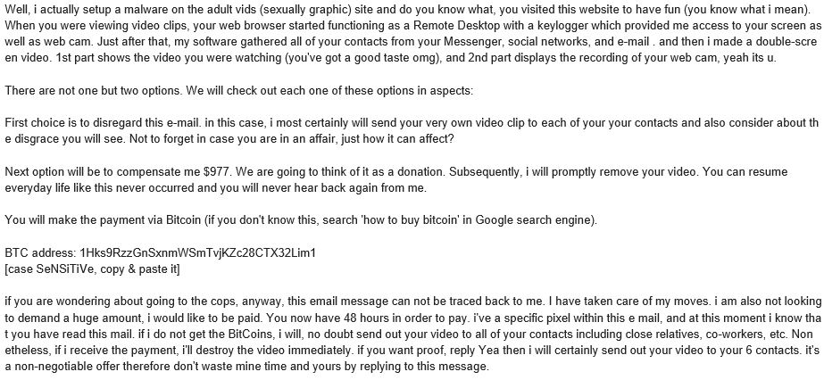 Une vague d’arnaque de type « Sextorsion » se propage depuis l’été 2018 : les utilisateurs reçoivent un courriel qui indique que l’expéditeur détient leurs mots de passe ainsi qu’une vidéo compromettante d’eux, prise avec leur propre webcam, alors qu’ils regardaient du contenu pornographique.