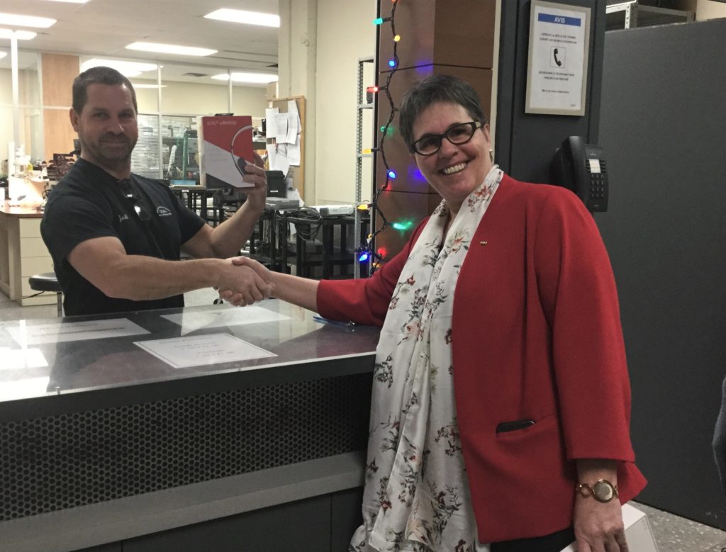 Gagnant du premier prix: Monsieur Stéphane Lavoie du Service des ressources humaines. Gagnant du deuxième prix: Monsieur Joël Otis du Service des technologies de l’information. Une belle visite et une belle surprise pour les gagnants en ce lundi matin. Félicitations !