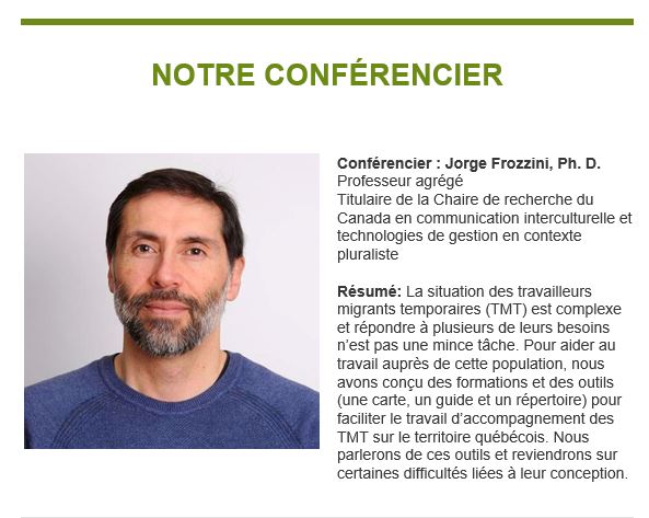 Monsieur Frozzini a présenté des outils conçus pour mieux accompagner les travailleurs migrants temporaires (TMT). Ces outils sont disponibles sur le site de la Chaire de recherche du Canada en communication interculturelle et technologies de gestion en contexte pluraliste.