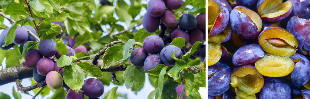 On retrouve différents pruniers à la forêt nourricière. Certaines variétés produisent des prunes jaunes et d’autres des prunes bleues !