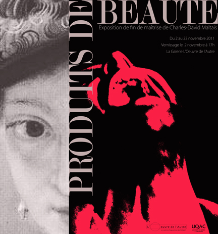 Depuis 2009, Charles-David Maltais poursuit une maîtrise en art à l’Université du Québec à Chicoutimi dont l’exposition Produits de beauté en est le point d’orgue. Sa pratique, récente, lui a permis de participer à des expositions collectives. Il s’agit de sa première exposition en solo.