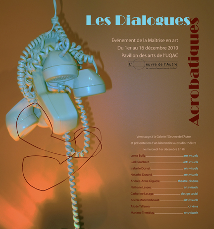 Cet événement organisé en collaboration avec la Galerie l’Œuvre de l’Autre, vous propose du 1ier au 16 décembre 2010 d’apprécier l’univers florissant de ces artistes hétéroclites. Neuf propositions en galerie et une présentation au studio-théâtre.