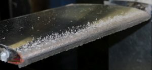 - Le second test, nommé Interaction Spray (IS), peut être réalisé avec des gouttes d’eau de mer de laboratoire et des nuages de gouttelettes de 2‰ NaCl, dont les tailles variaient de 169 à 6097 μm. Ces dernières sont générées à partir des ondes produites par une plaque mobile poussant l’eau salée dans un bassin, maintenu à une température d’environ -0,5 °C, selon des séquences marche/arrêt de 7s et 40s ; ces intervalles de temps sélectionnés permettent à l’eau surfondue de geler complètement sur les échantillons.