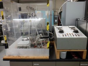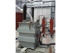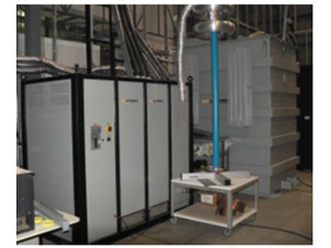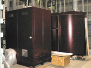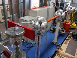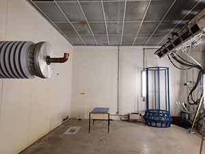 Système à courant alternatif et courant continu (CA/CC) 120 kV (transformateur-régulateur gris à l’extérieur de la cage de Faraday, transformateur de puissance et quelques composants (condensateurs, résistances, diodes) proches du mur de la deuxième chambre climatique dans la cage)