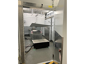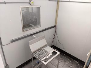 Cette chambre réfrigérée permet la simulation de tempête de neige artificielle et de précipitation givrante de bruine verglaçante. L’ouverture de la porte de la chambre permet l’étude de divers objets de moyennes et grandes dimensions. Elle est utilisée pour la simulation des essais sur piste d’aéroport.