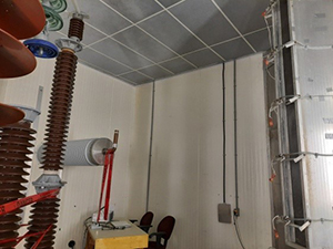 Système à courant continu (CC) 300 kV (deux enceintes grises au milieu dans la cage de Faraday)