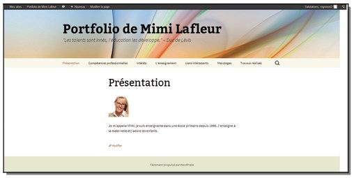 WordPress est un logiciel libre et gratuit qui permet de créer des sites Web personnels. Avec WordPress, vous pouvez réaliser facilement votre propre portfolio, ayant l’apparence de celui ci-dessous, sans même connaître le fonctionnement de la programmation informatique. Il suffit d’écrire votre texte de la même façon qu’avec un traitement de texte, le traiter avec les boutons standards (gras, italique, souligné, etc.), insérer des images, des liens, … enregistrer et votre portfolio sera automatiquement publié sur le Web. Toutes les informations qui y sont versées sont hébergées sur nos serveurs, ici à l’UQAC.