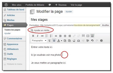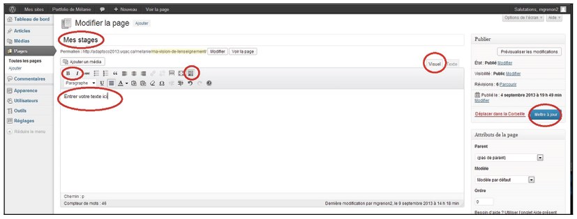 Dans le grand encadré blanc, vous pouvez écrire le texte qui composera cette page, y verser des images (voir l’étape #9), des tableaux, faire du copier-coller (de « Word » ou autre logiciel vers votre portfolio), verser des liens (voir l’étape #10), des documents (voir l’étape #11) etc. Vous n’avez qu’à vous assurer que vous êtes dans l’onglet « Visuel » et non « Texte » (car l’onglet « Texte » inclut également le code de programmation utile à bâtir votre page) et ensuite, comme avec le traitement de texte « Word », vous pouvez sélectionner votre texte et le traiter avec les boutons de traitement (gras, italique, souligné). Si les boutons d’édition de texte ne sont pas tous présents, cliquez sur le dernier bouton de la première rangée et une rangée supplémentaire apparaîtra. Lorsque vous avez terminé de concevoir une page, cliquez sur le bouton « Mettre à jour » pour enregistrer vos changements. - Insérez une image dans une page