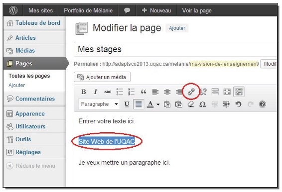 a) Dans la page de votre choix, dans l’encadré blanc, inscrire le texte sur lequel il faudra cliquer pour accéder à votre site web (ex. : Site Web de l’UQAC), sélectionnez ce texte ;