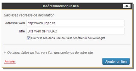 c) Une fenêtre s’ouvrira, entrez l’adresse complète de votre lien dans le champ « Adresse web » (ex. : http://www.uqac.ca);