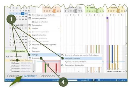 - Avec le bouton droit de la souris, cliquer sur le calendrier à partager. Dans le menu qui s’affiche, choisir « Partager » et ensuite « Partager le calendrier »;