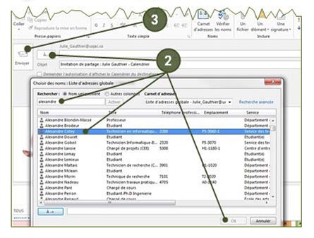 - À l’ouverture du message « Invitation de partage » cliquer à gauche sur « À… » ; la liste d’adresses globales s’affichera. Saisir le prenom de la personne qui doit partager le calendrier, son nom apparaîtra dans la liste. Double-cliquer sur son nom et ensuite sur « OK ». Son nom s’inscrira dans le champ « À… » ;