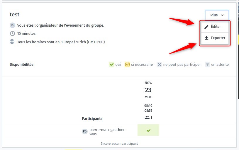 . - Le bouton « Plus »permet d’éditer l’événement et de pouvoir exporter le tout dans une grille Excel. Vous avez aussi un visuel de la date, de l’heure et du nombre de participants ;
