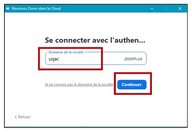 - La fenêtre suivante s’ouvrira, écrire « uqac » dans le champ « Domaine de la société » et cliquer sur Continuer: