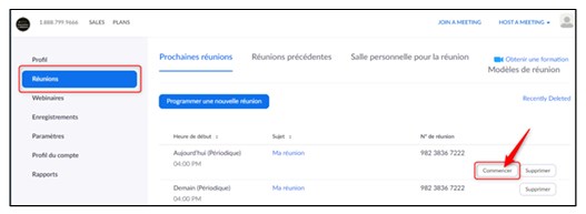 D. Si vous ne vous souvenez plus de votre compte UQAC et/ou de votre mot de passe, cliquer sur le lien « Compte oublié ? » ou sur « Mot de passe oublié ? » et suivre les indications qui s’afficheront à l’écran. Si vous êtes un employé nouvellement embauché à l’UQAC et que vous n’avez jamais accédé à votre compte Intranet et/ou votre portail employé, vous devez, au préalable, cliquer sur le lien « Activer mon compte »; - Cliquer sur l’icône « Réunions » et ensuite sur le bouton « Commencer » vis-à-vis la réunion que vous aurez planifiée préalablement :