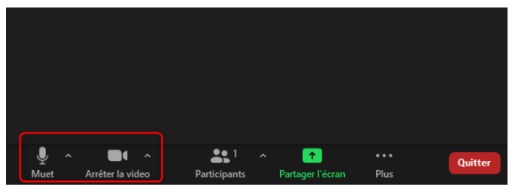 - Vous assurez que le son et la caméra de votre réunion soient activés (ils doivent apparaître sous cette forme, s’ils ont un trait rouge par-dessus c’est qu’ils sont désactivés. Pour les activer, cliquer sur ceux ayant un trait rouge par-dessus) :