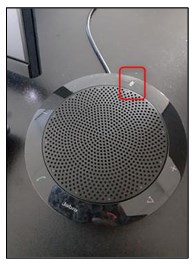 - Vous assurez que le micro « Jabra » qui se trouve sur le meuble soit ouvert, toutes les lumières NE DOIVENT PAS être ROUGES, si elles sont rouges, cliquer sur le bouton sur le dessus du micro jusqu’à ce que les lumières ne soient plus ROUGES :