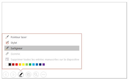 - Si vous désirez utiliser un pointeur laser, un surligneur ou un stylet pour annoter votre document PowerPoint durant votre présentation, cliquer sur le bouton représenté par un crayon, figurant dans le coin inférieur gauche, choisir l’outil de votre choix (pointeur laser, stylet ou surligneur), choisir votre couleur et vous pourrez l’outil choisi directement pardessus votre présentation PowerPoint; Sachez que l’écran de gauche (de marque Dell) est tactile et que chaque salle de classe dispose d’un stylet, ce qui peut être plus facilitant pour annoter vos présentations si vous utilisez le stylet directement sur l’écran tactile;