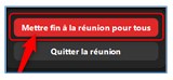 - Lorsque vous avez terminé, si vous avez enregistré votre cours, votre enregistrement sera transféré automatiquement dans votre compte Zoom et votre compte Panopto mais, pour ce faire, vous devez absolument cliquer sur le bouton « Fin » et cliquer sur « Mettre fin à la réunion pour tous »;
