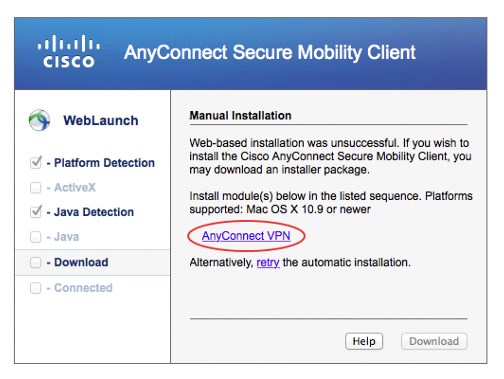 Après quelques secondes, le navigateur vous proposera un lien de téléchargement. Cliquer sur AnyConnect pour télécharger le programme d’installation du client Cisco AnyConnect.