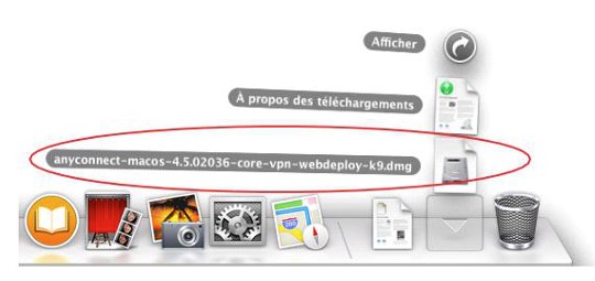 Cliquer sur l’icône Téléchargements pour afficher les fichiers téléchargés. Identifier le programme d’installation anyconnectmacos…dmg et cliquer le pour ouvrir l’archive.