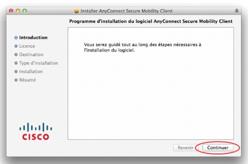 Doublecliquer sur le paquet anyconnectmacos…pkg pour démarrer l’installation du client VPN.