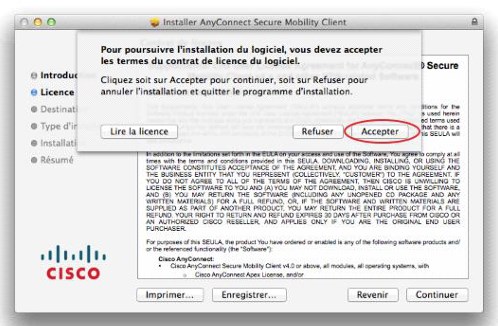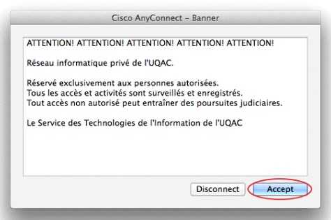 Accepter les conditions d’utilisations du client VPN en cliquant sur le bouton Accepter.