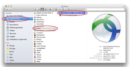 Le programme est installé dans le répertoire Applications/Cisco. Double-cliquer sur l’application Cisco AnyConnect pour lancer le client VPN.