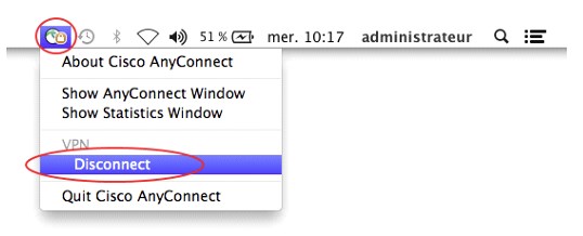 Cliquer sur l’icône Cisco AnyConnect dans la barre de tache (en haut à droite, près de l’horloge) et cliquer sélectionner Disconnect.