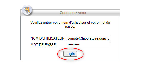 . - Entrer votre compte laboratoire (au format compte@laboratoire.uqac.ca) et votre mot de passe dans les champs respectifs;
