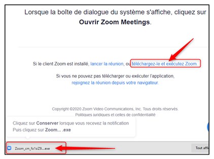 4. La PREMIÈRE fois que vous tenterez de vous brancher à Zoom, la fenêtre suivante s’affichera et vous devrez installer Zoom sur votre ordinateur.  Pour ce faire, cliquer sur le lien « téléchargezle et exécutez Zoom », le fichier d’installation s’affichera dans le coin inférieur gauche de votre écran, cliquer dessus et suivre les indications à l’écran :