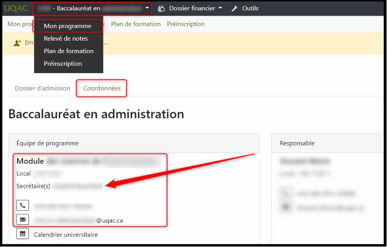 Entre-temps, vous pouvez communiquer avec votre professeur par courriel. Si vous ne disposez pas de son adresse courriel, vous référer à la secrétaire de votre département. Les coordonnées de la secrétaire de votre département se retrouvent à cet endroit dans votre portail étudiant :