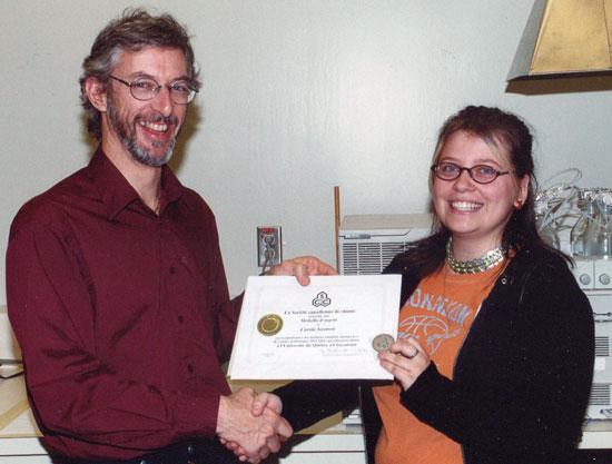 Mme Carole Grenon reçoit ici la médaille et le certificat d'attestation des mains de M. Denis Bussières, professeur de chimie au Département des sciences fondamentales de l'UQAC.L’Institut de chimie du Canada (section Saguenay) a remis la médaille de la Société canadienne de chimie et un certificat d’attestation à Mme Carole Grenon, étudiante au baccalauréat en chimie à l’Université du Québec à Chicoutimi. Mme Grenon s’est démarquée par la très grande qualité de son dossier académique après deux année d’études dans ce programme. Il s’agit d’une récompense de la Société canadienne de chimie visant à encourager l’excellence chez les étudiants inscrits dans un programme d’études en chimie.