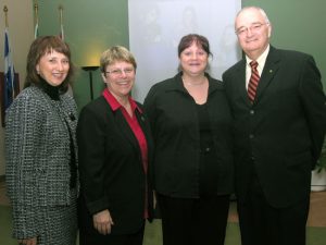 De gauche à droite : Madame Hélène Boulianne, présidente de l'Ordre régional des infirmières et infirmiers du Saguenay–Lac-Saint-Jean/Nord-du-Québec; Madame Danielle Poirier, directrice du Module des sciences infirmières et de la santé et professeur au Département des sciences humaines; Madame Nicole Martel, diplômé du baccalauréat en sciences infirmières; Monsieur Michel Belley, recteur de l'Université du Québec à Chicoutimi. Lors de la soirée Madame Hélène Boulianne, de l'Ordre régional des infirmières et infirmiers du Saguenay–Lac-Saint-Jean/Nord-du-Québec (debout, à gauche); un groupe de finissantes du baccalauréat en sciences infirmières; Monsieur Michel Belley, recteur; Madame Danielle Poirier, directrice du Module (assise, à gauche).Les diplômés du baccalauréat en sciences infirmières – formation initiale – se sont classés en seconde position, à l’échelle du Québec, au volet pratique de l’examen de l’Ordre des infirmières et infirmiers du Québec (OIIQ). Le groupe de finissants de l’UQAC a obtenu la deuxième meilleure moyenne générale et ce, parmi 49 groupes présents. Cet examen professionnel est la dernière étape qui mène à l’obtention du permis d’exercice de la profession d’infirmière.
