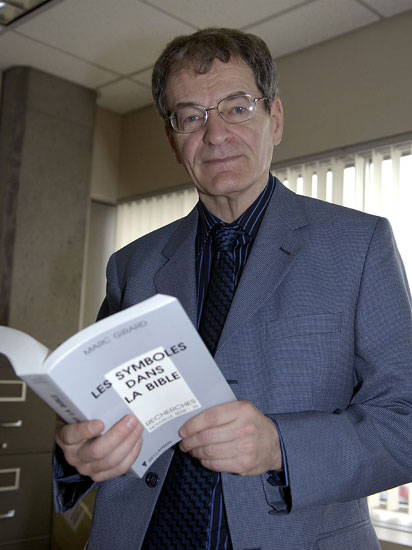 RECONNU – Les nombreux articles et ouvrages écrits par le prêtre Marc Girard, également professeur et chercheur à l'UQAC, lui valent une reconnaissance internationale, notamment en matière de traduction des textes sacrés et de symbologie religieuse. (Photo : Jeannot Lévesque)