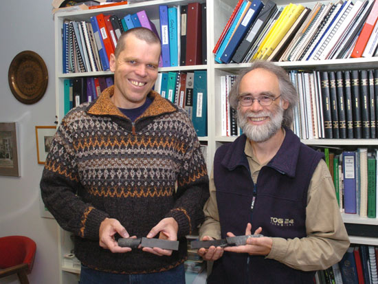 De gauche à droite, Messieurs Wolfgang Maier et Michael Higgins, professeurs à l'Unité d'enseignement en sciences de la Terre, Département des sciences appliquées, ont publié, avec un groupe d'auteurs, les résultats de leurs travaux dans la revue « Nature ».Les professeurs Wolfgang Maier et Michael Higgins, de l’Unité d’enseignement en sciences de la Terre à l’Université du Québec à Chicoutimi, ainsi que leurs collègues provenant d’autres universités, ont découvert et analysé un météorite issu du cratère de Morokweng, en Afrique du Sud. L’existence de ce météorite est étonnante en raison du fait que la chaleur dégagée par un impact de météorite provoque habituellement la disparition de l’objet. Or, dans le cratère en question, on a trouvé un morceau intact de l’astéroïde à l’origine de l’impact, ce qui est tout à fait exceptionnel.