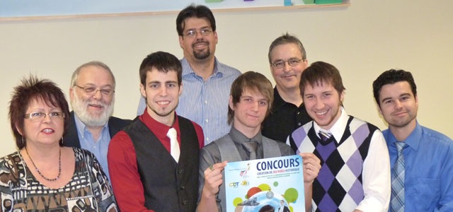 Sur la photo, de gauche à droite : Line Gagnon, directrice générale des Fêtes du 175e du Saguenay−Lac-Saint-Jean, Louis Dussault, professeur et directeur général du CEE-UQAC, Dany Hudon, gagnant, Éric Tremblay, historien, Jérémie Fradet, gagnant, Yves Chiricota, professeur et directeur scientifique du CDT-UQAC, Yan-Simon Martel Lussier, gagnant, et Bruno Bouchard, professeur et coordonnateur de projets en jeu vidéo au CDT-UQAC.