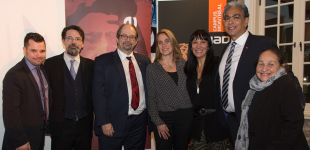Photo : Mathieu Gravel, agent de liaison au Centre des Premières Nations Nikanite de l’UQAC; Pierre Tousignant, professeur à l’École des arts numériques, de l’animation et du design de l’UQAC; Geoffrey Kelley, ministre responsable des Affaires autochtones; Suzanne Guèvremont, directrice de l’École des arts numériques, de l’animation et du design de l’UQAC; Nadine St-Louis, directrice de l’Espace Culturel Ashukan; Marco Bacon, directeur du Centre des Premières Nations Nikanite; et Joséphine Bacon, poète innue