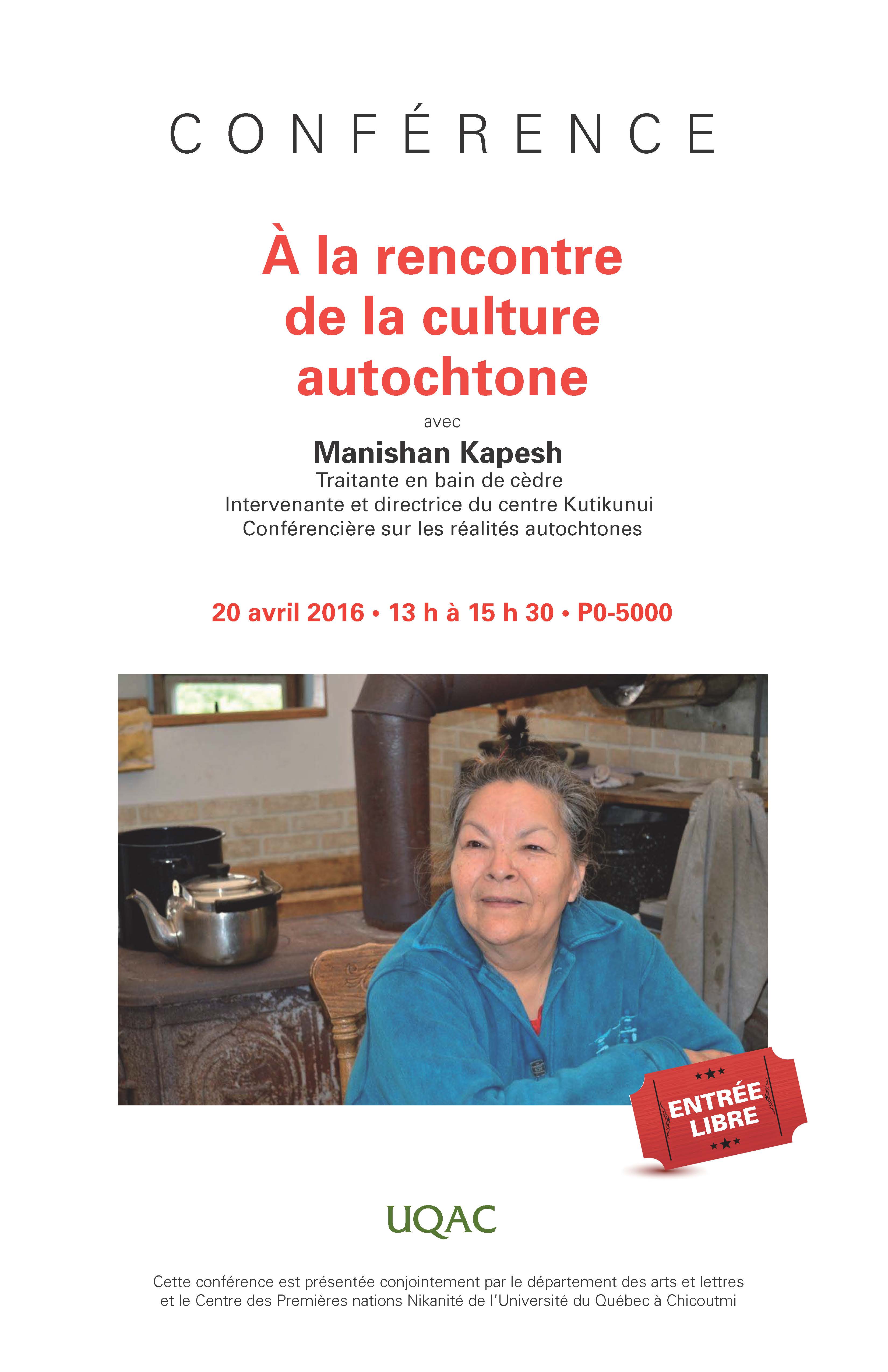 Le Centre des Premières Nations Nikanite (CPNN), en collaboration avec le Département des arts et lettres, convie la communauté universitaire à assister à la conférence de Marie-Jeanne André (Manishan Kapesh) :