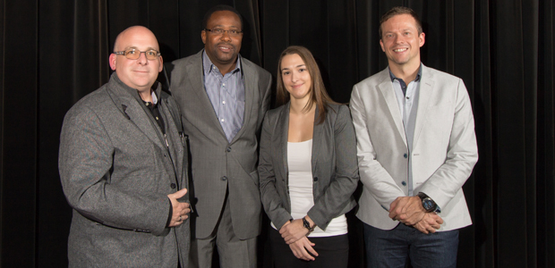 Photo : Les conférenciers de la 4e édition des Rendez-vous critiques : Érick Chamberland, Cheikh Faye, Laetitia Larouche et Martin Perron