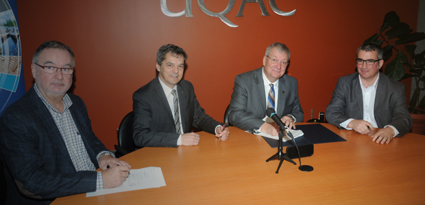 Photo : Martin Côté, vice-recteur aux affaires étudiantes et secrétaire général de l’UQAC; Martin Gauthier, recteur de l’UQAC; Luc Blanchette, ministre des Forêts, de la Faune et des Parcs; Pascal Sirois, professeur au Département des sciences fondamentales de l’UQAC
